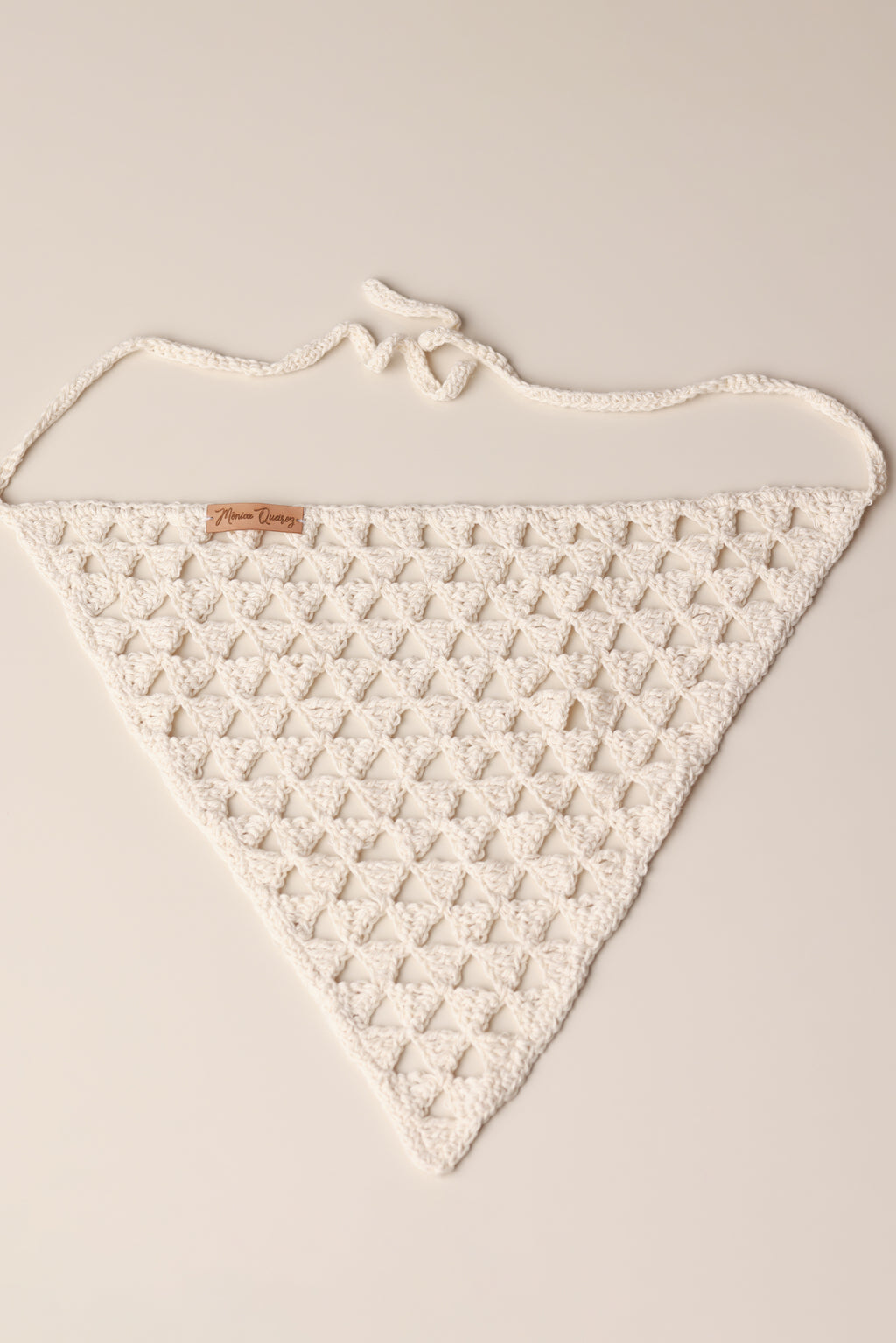 Modelo Bandana Serena, confeccionado em fio de algodão com alças do próprio fio para amarração (35 cm cada).