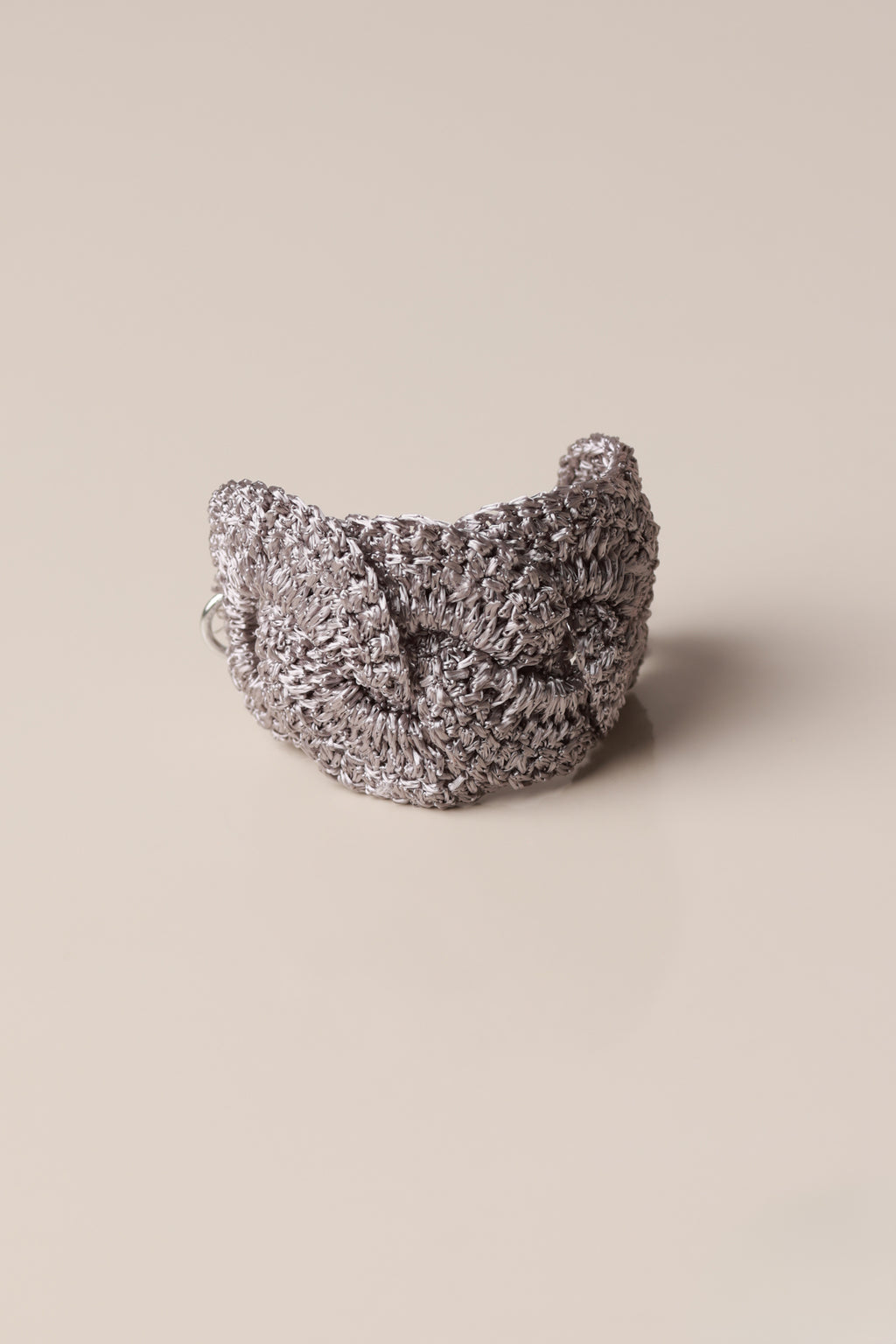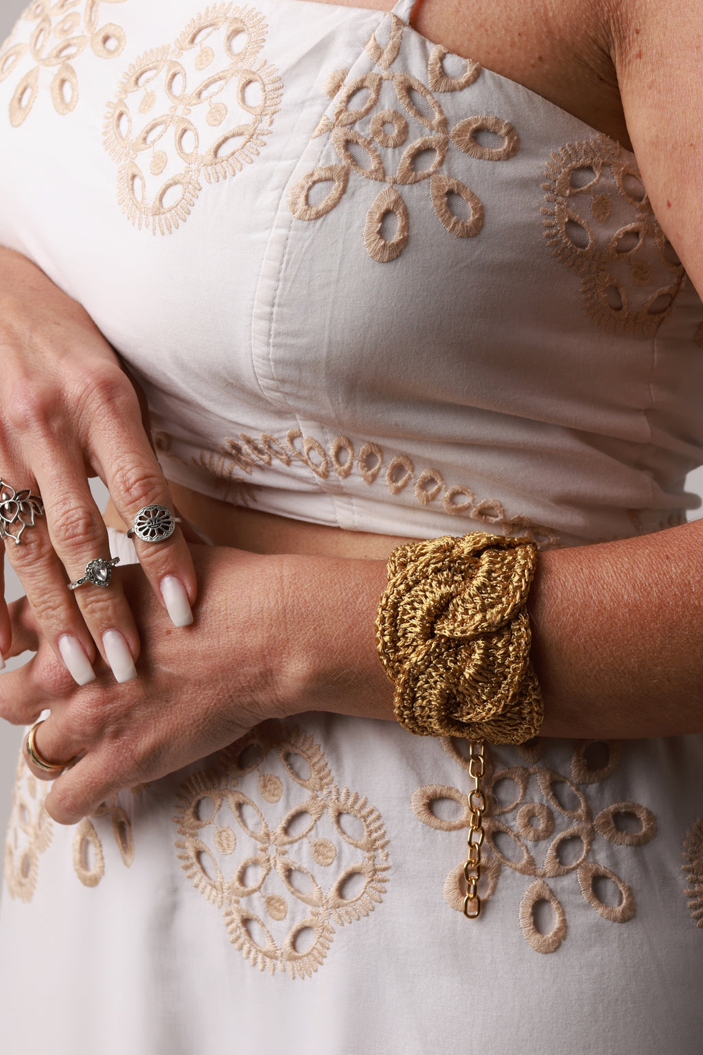 Modelo Bracelete Charme, confeccionado em fio 100% viscose com corrente e fecho mosquetão ajustável.