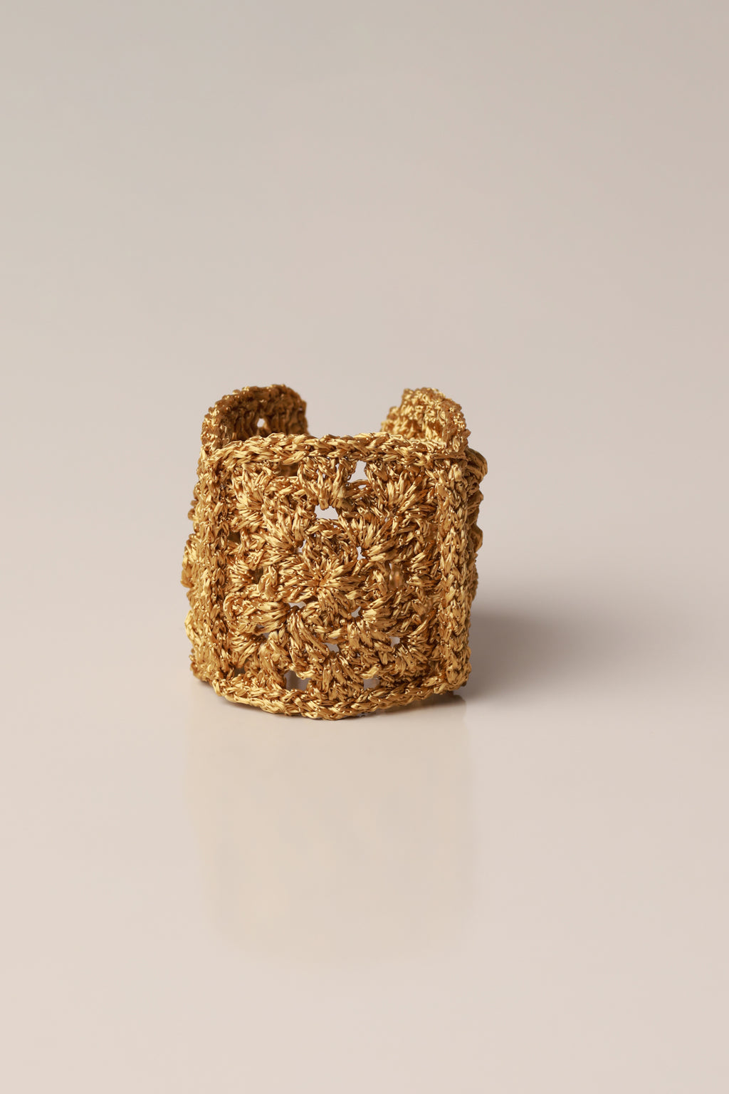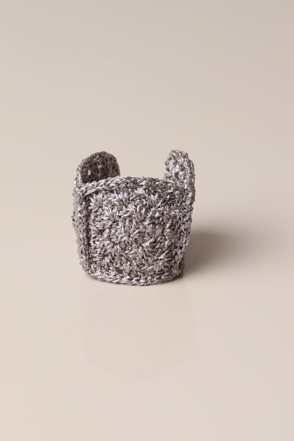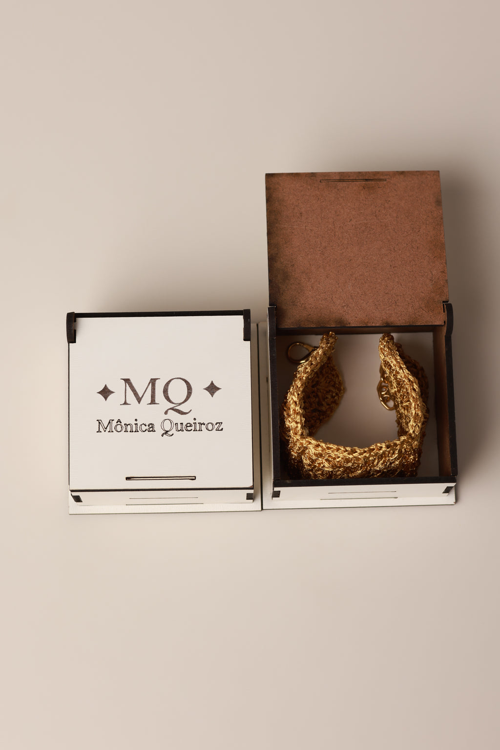 Modelo Bracelete Elegance, confeccionado em fio 100% viscose com corrente ajustável e fecho mosquetão.