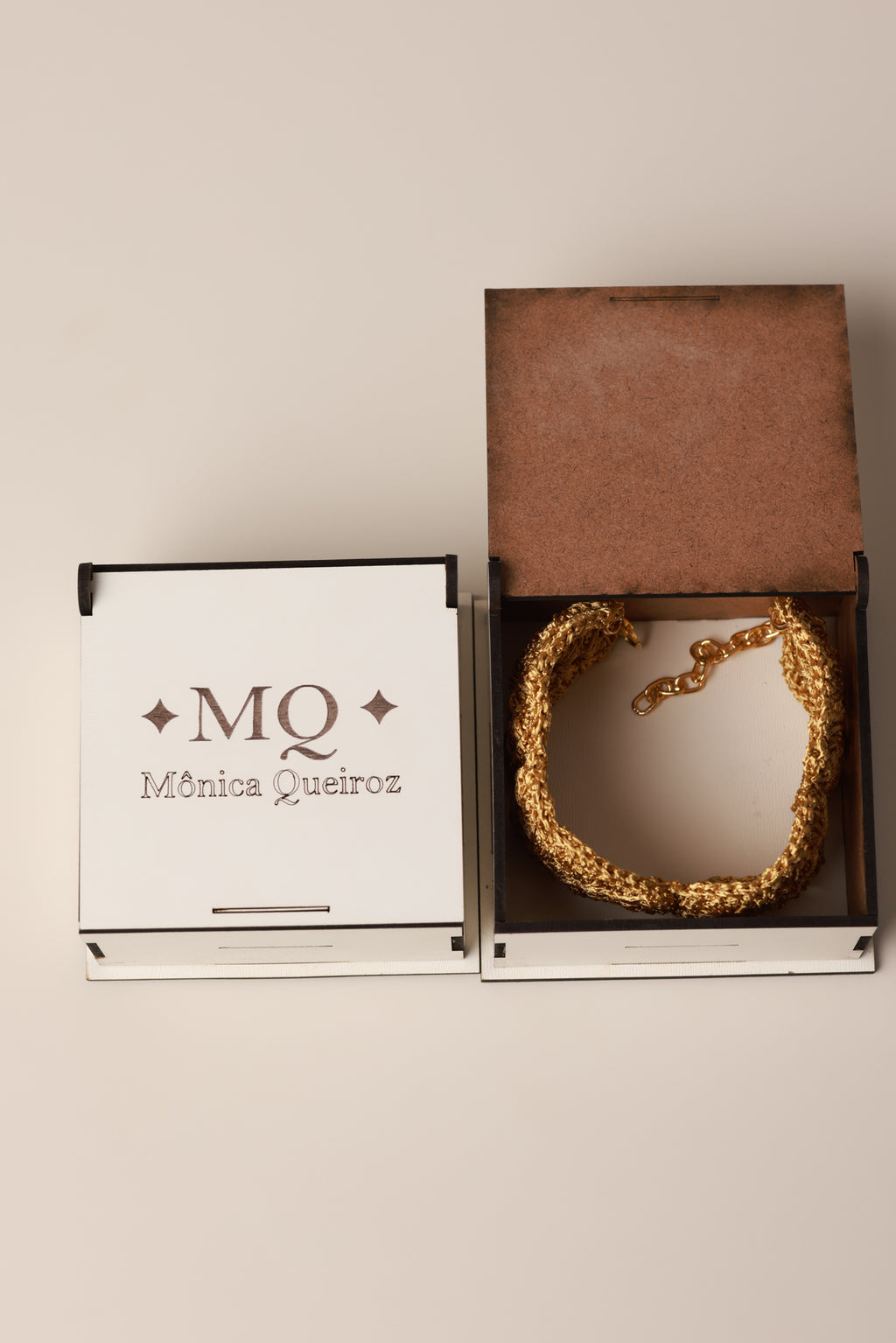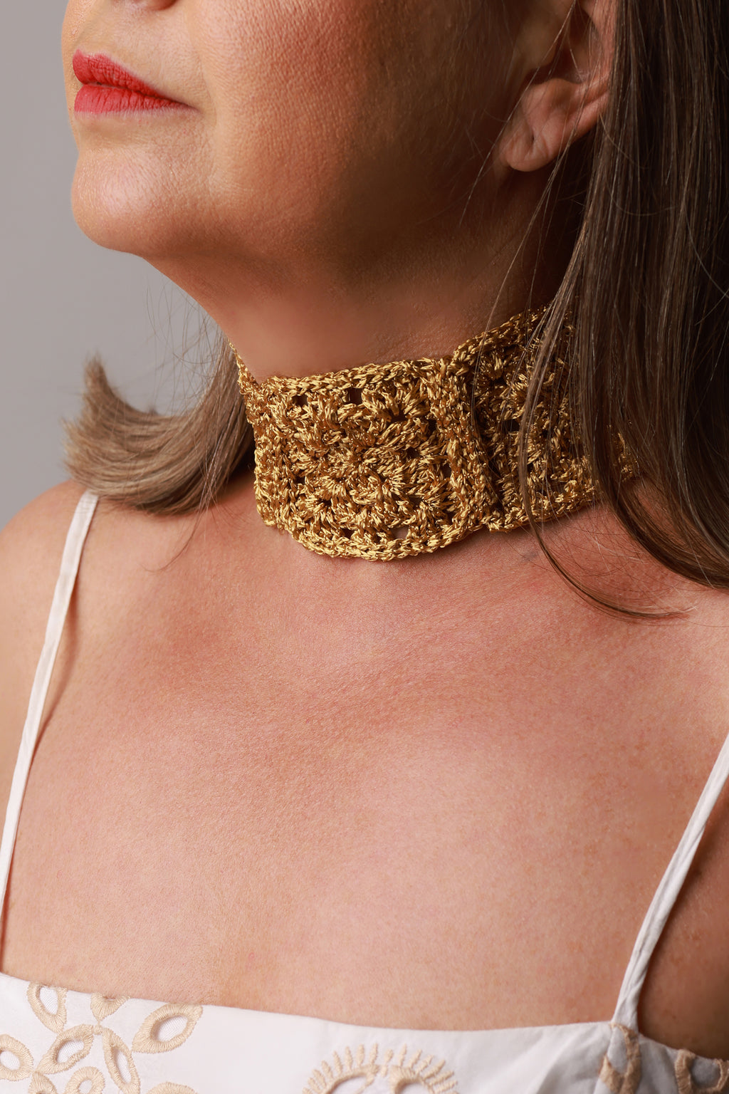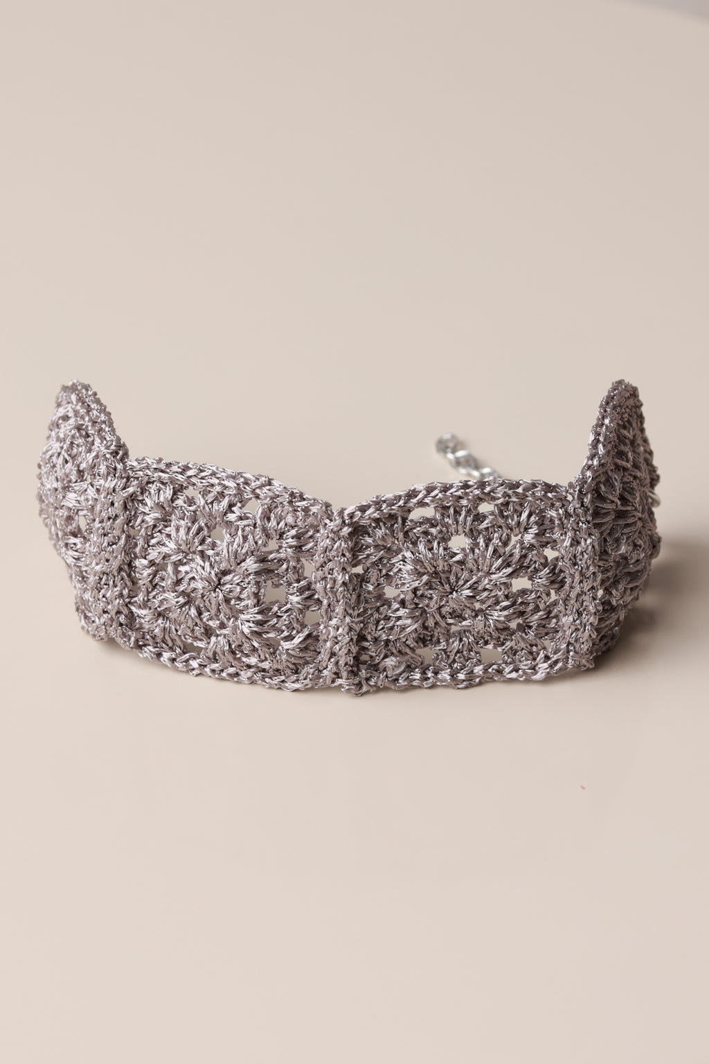 Modelo Colar Elegance, confeccionado em fio 100% viscose com corrente ajustável e fecho mosquetão.