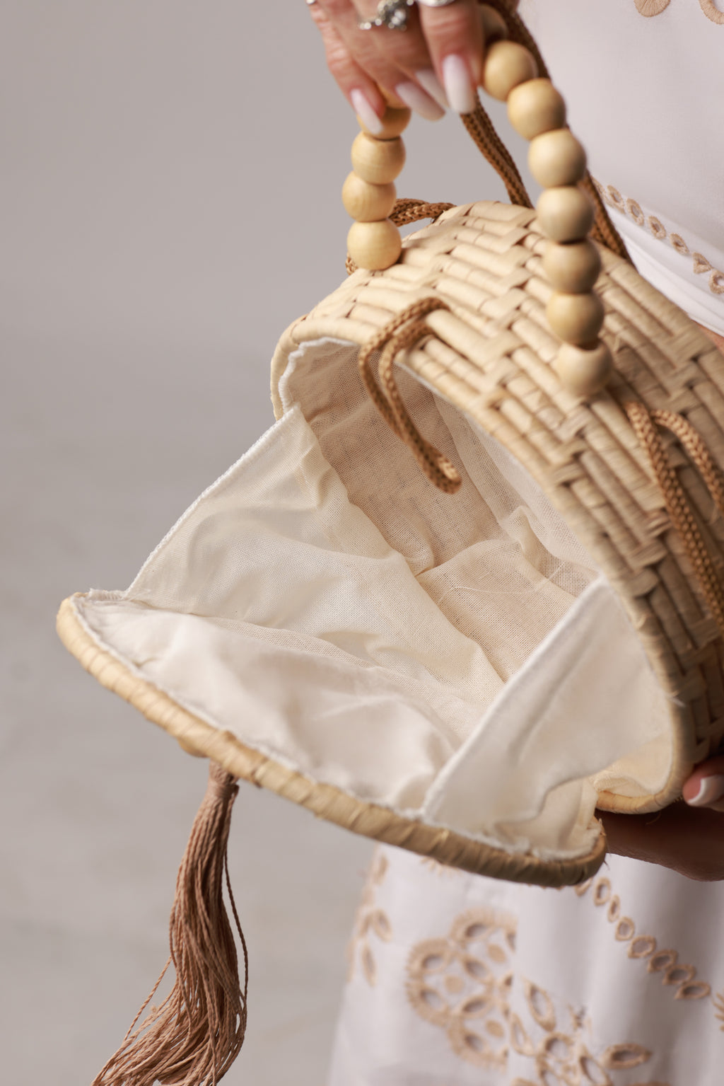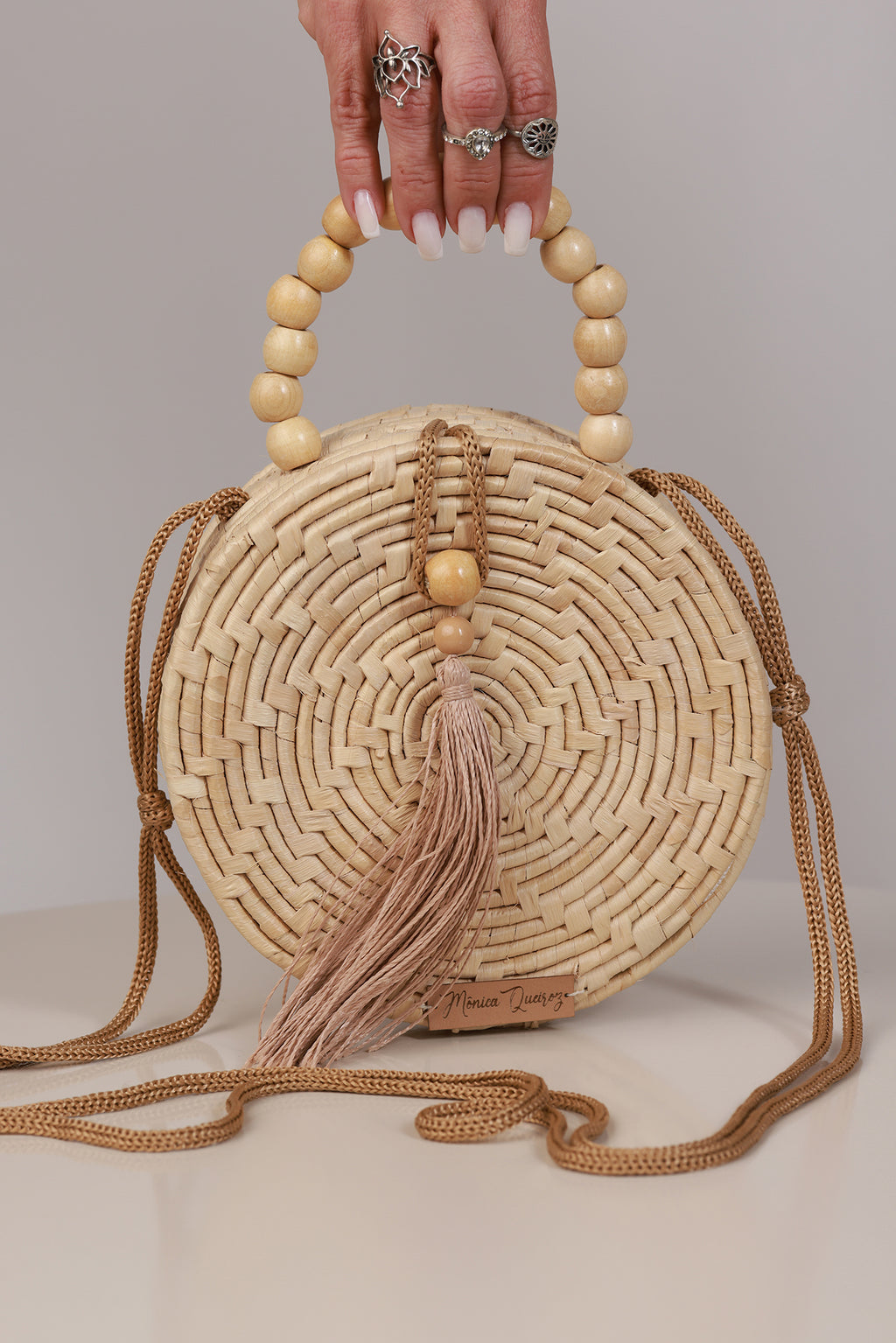 Possui alça feita em fio náutico e inclui um pingente decorativo artesanal.