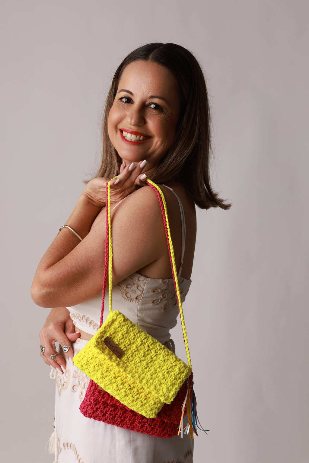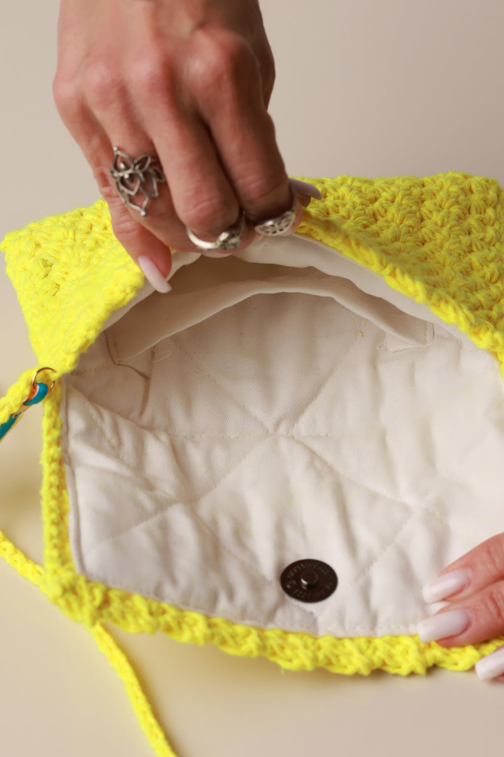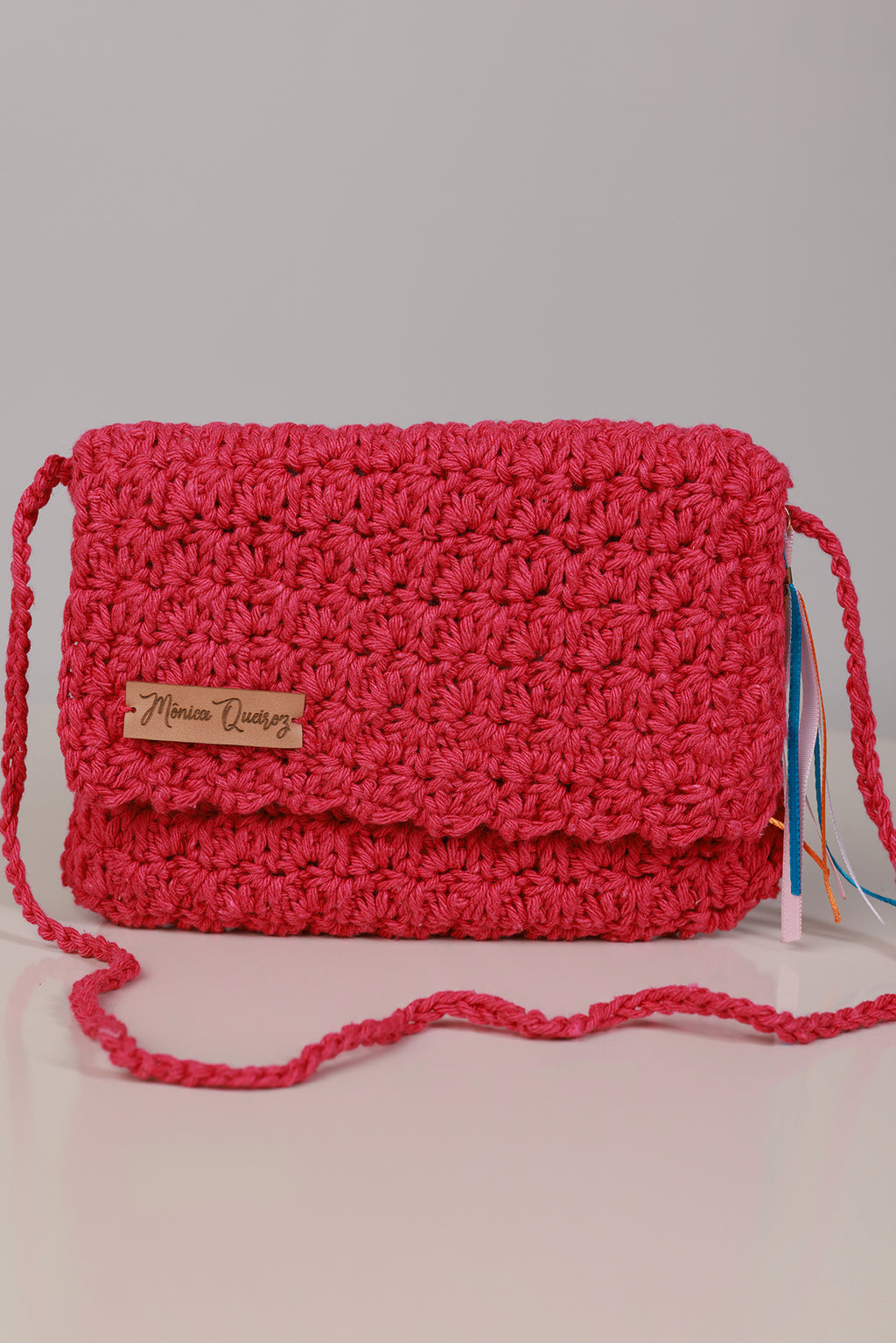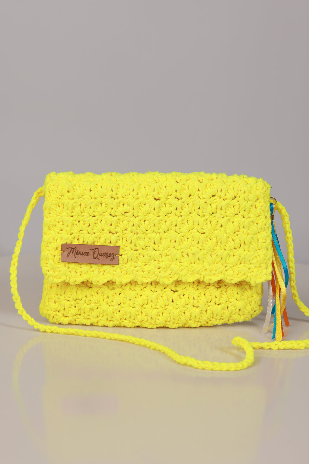 Possui fecho com botão de ímã e alça de crochê feita à mão.