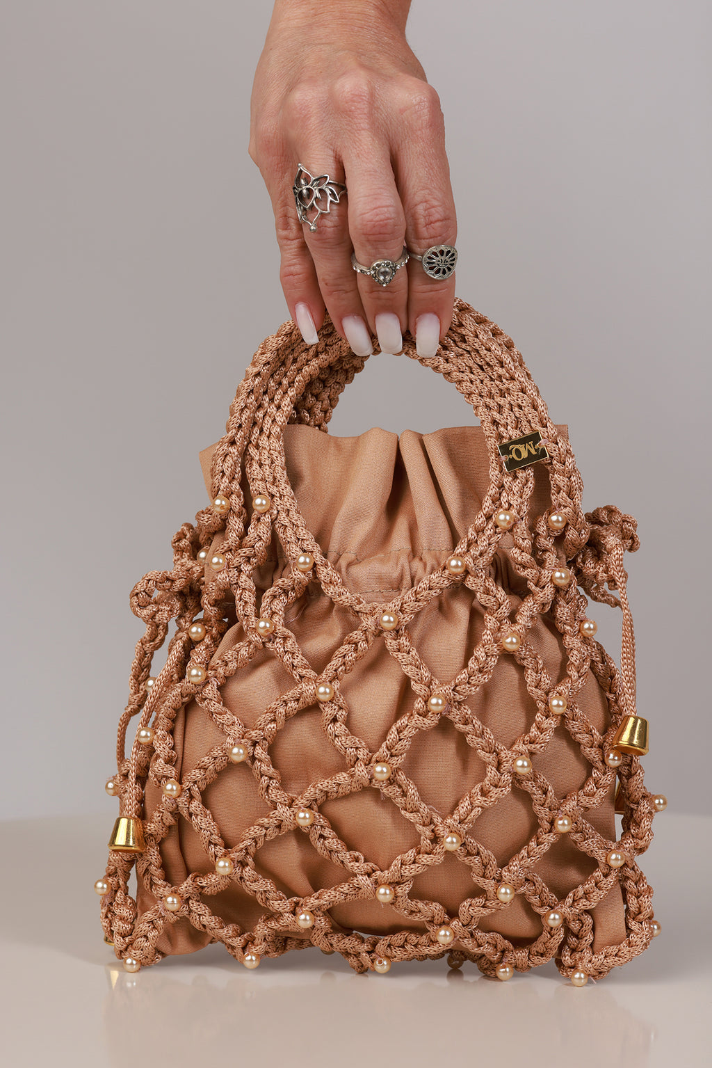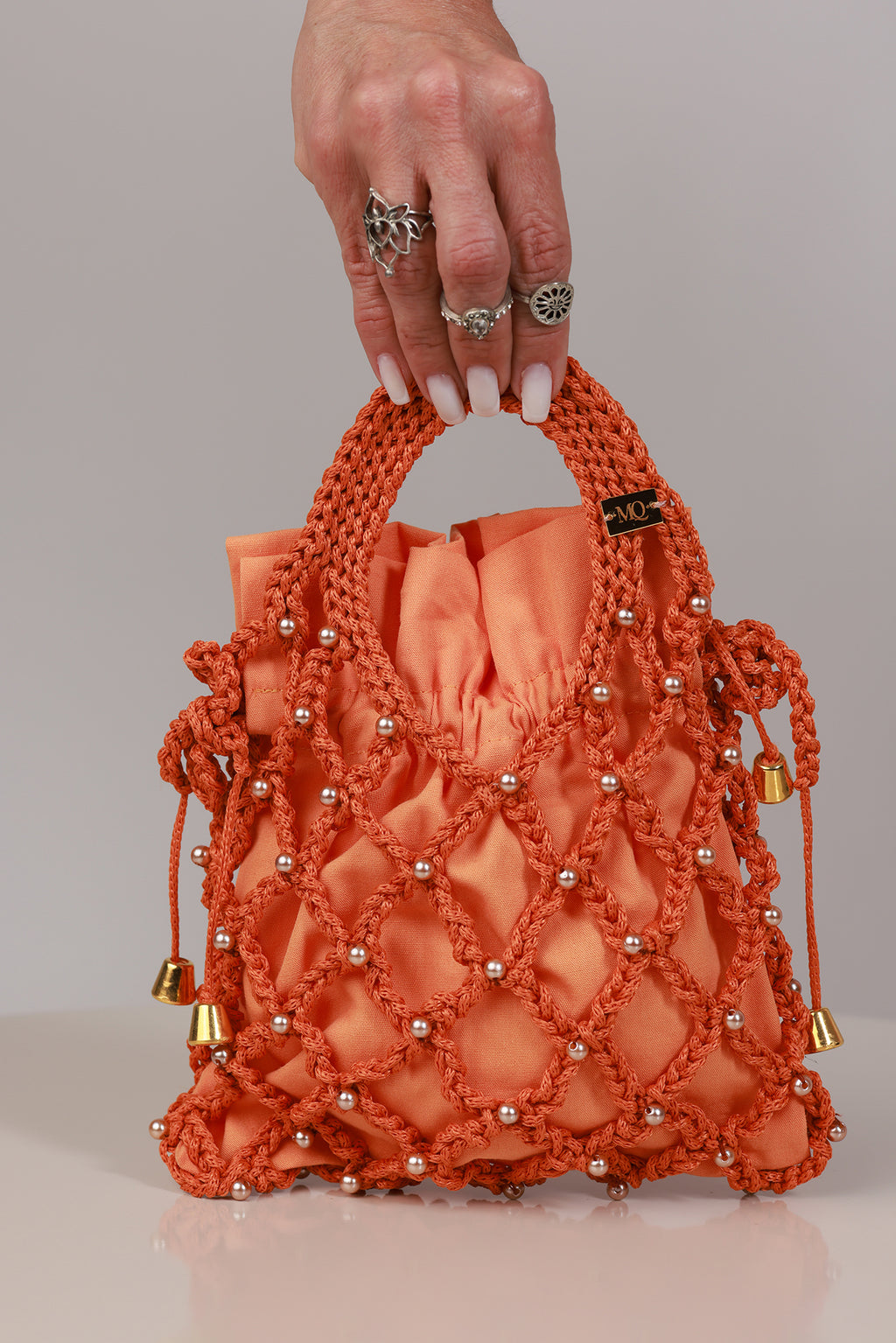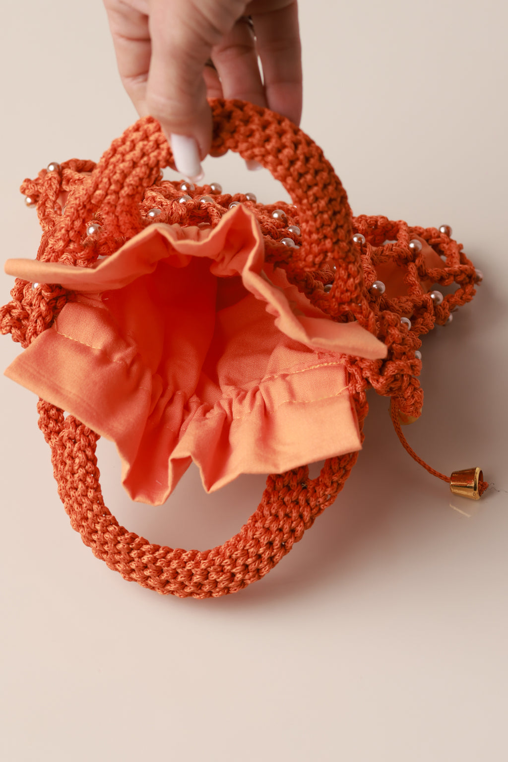 Bolsa Modelo Helena. Este modelo apresenta acabamento com detalhes em pérolas e uma alça de crochê. O interior da bolsa é revestido com forro em tecido 100% algodão.
