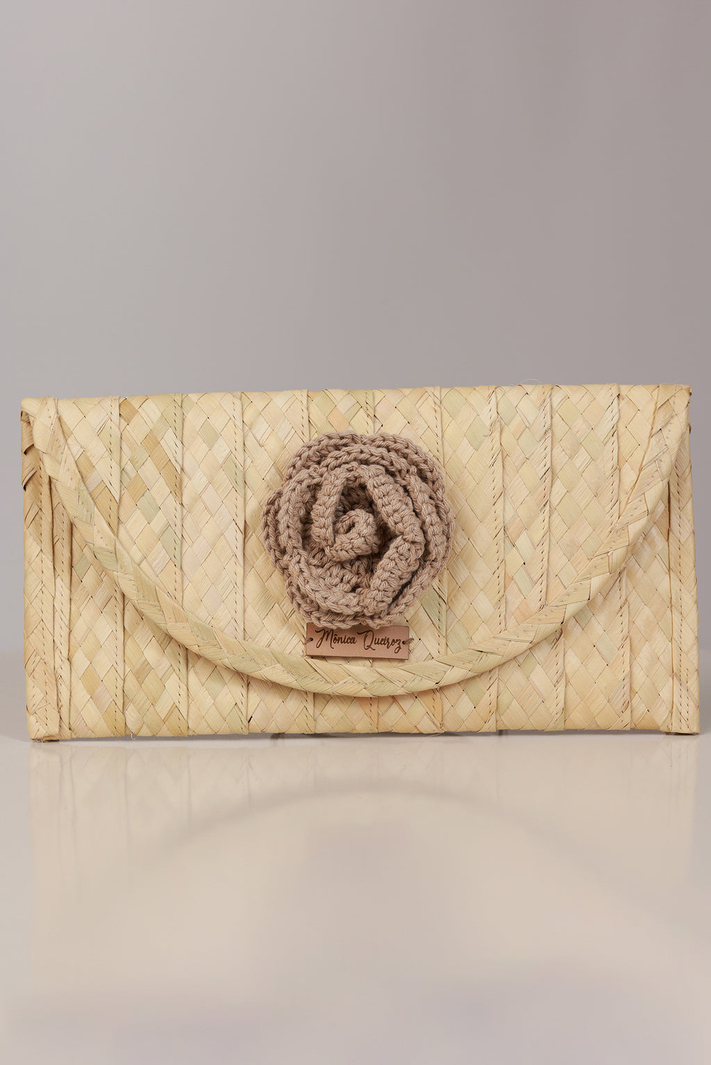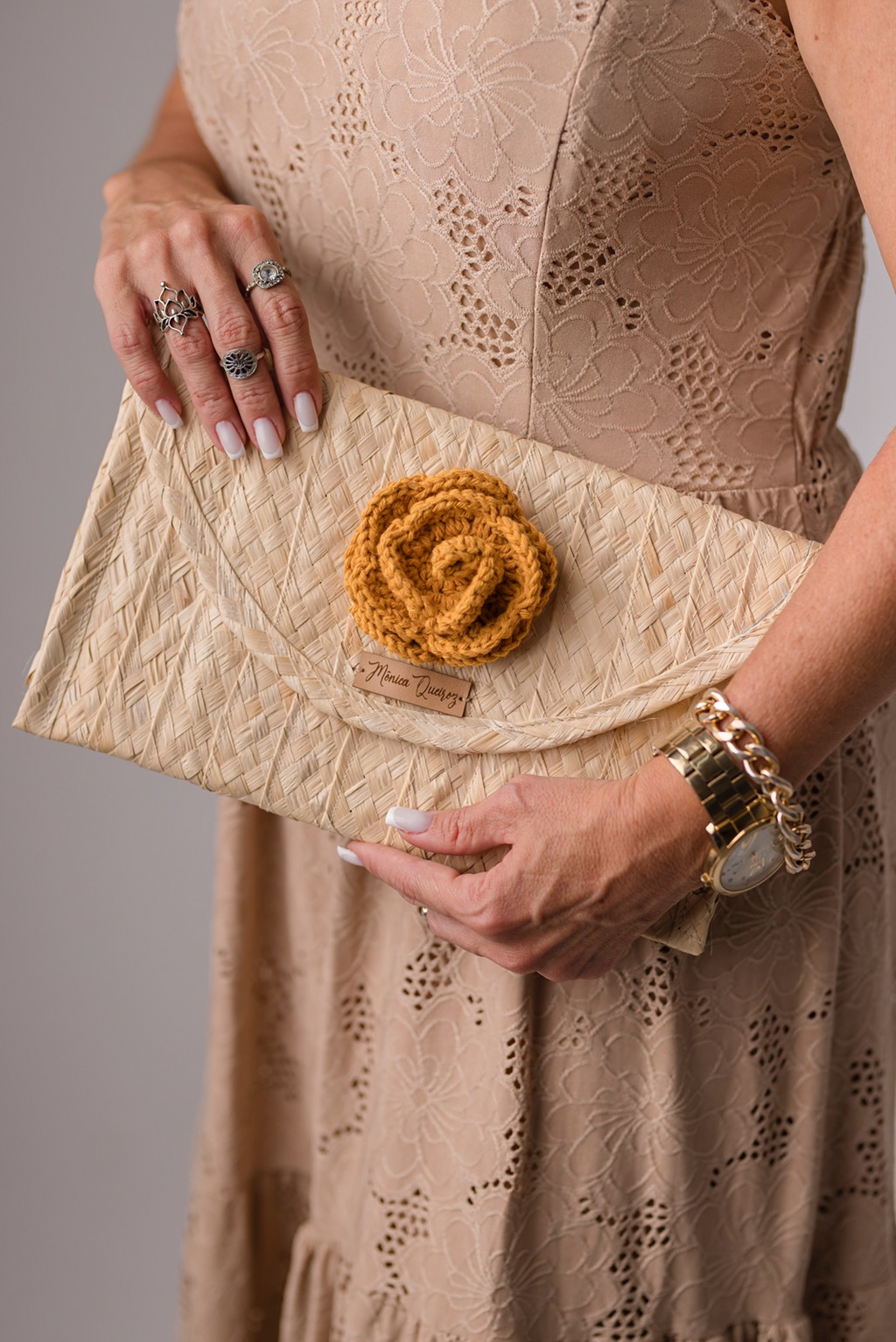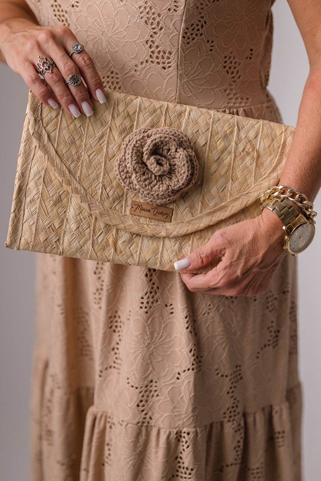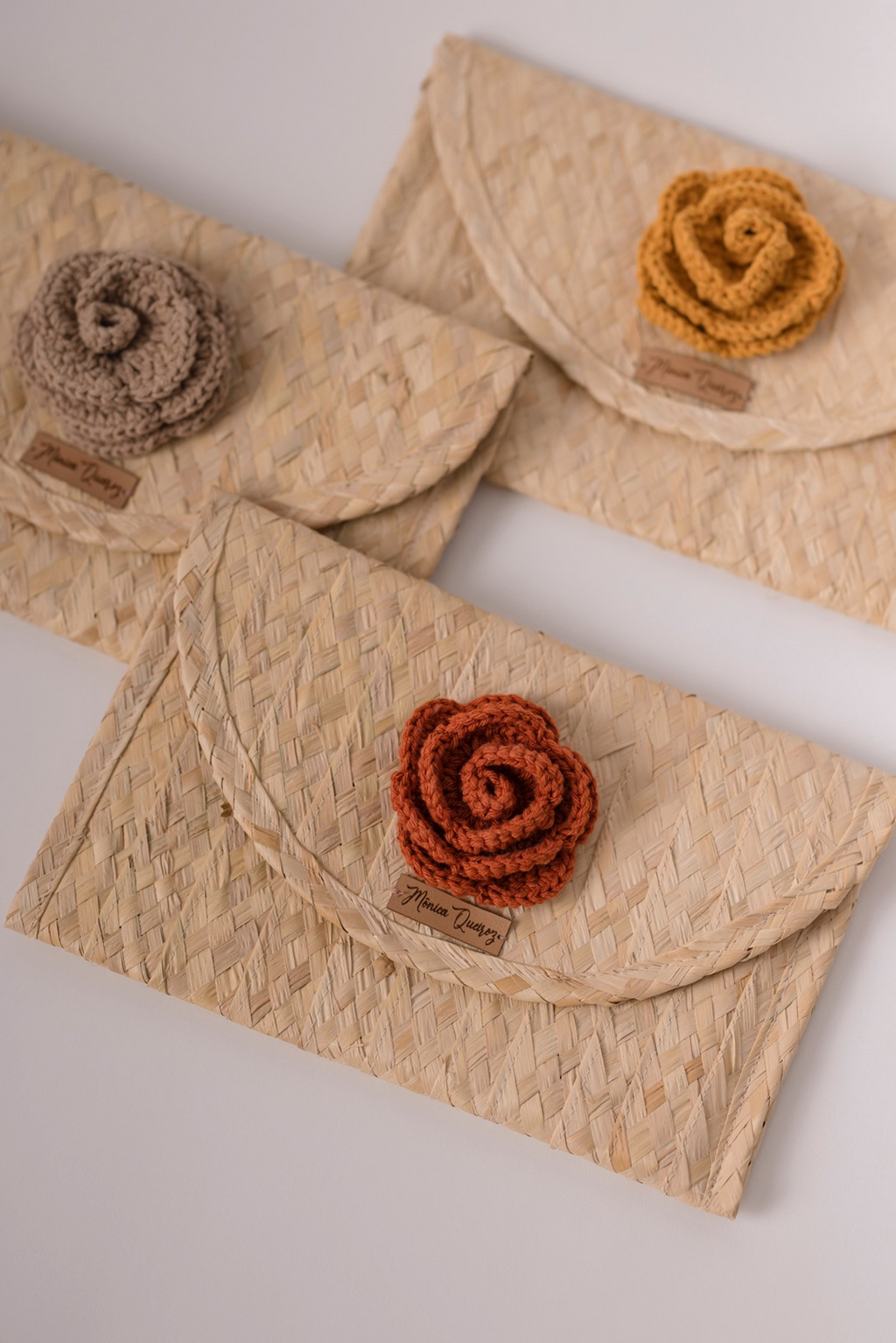 Este modelo possui formato carteira, fechamento com botão de ímã e um detalhe floral em crochê aplicado.