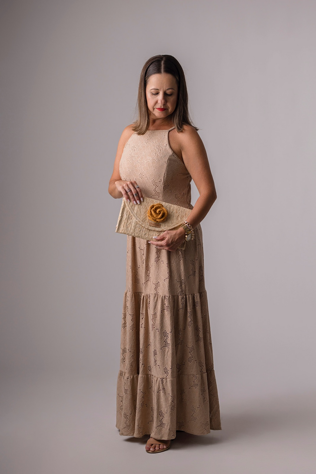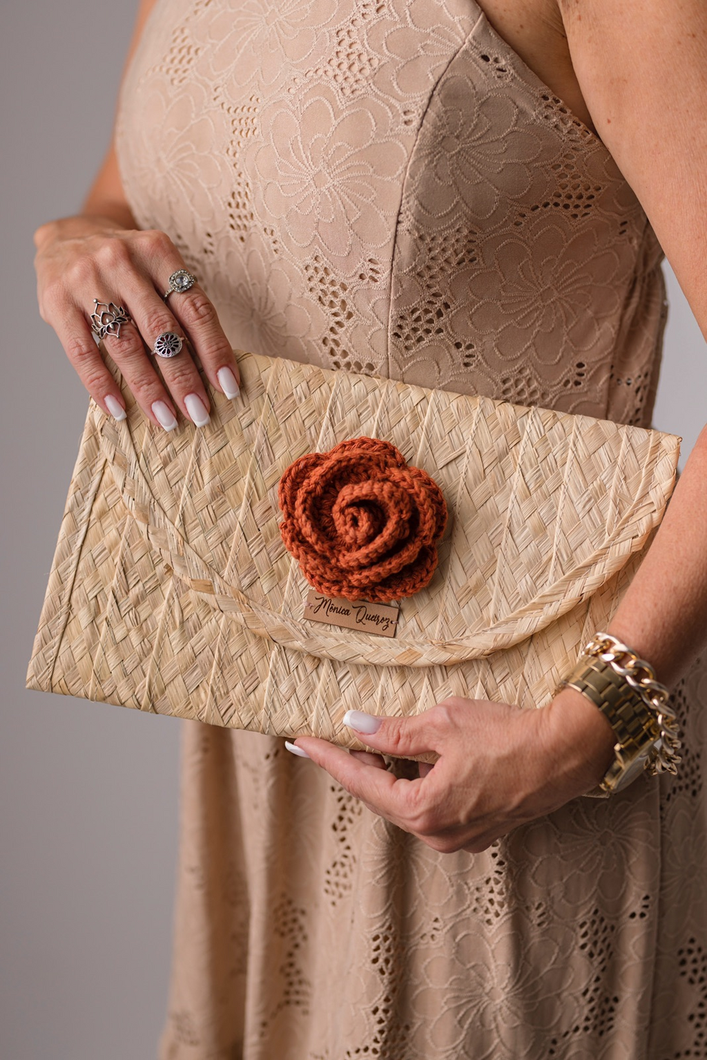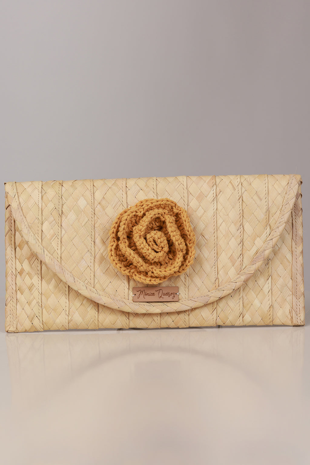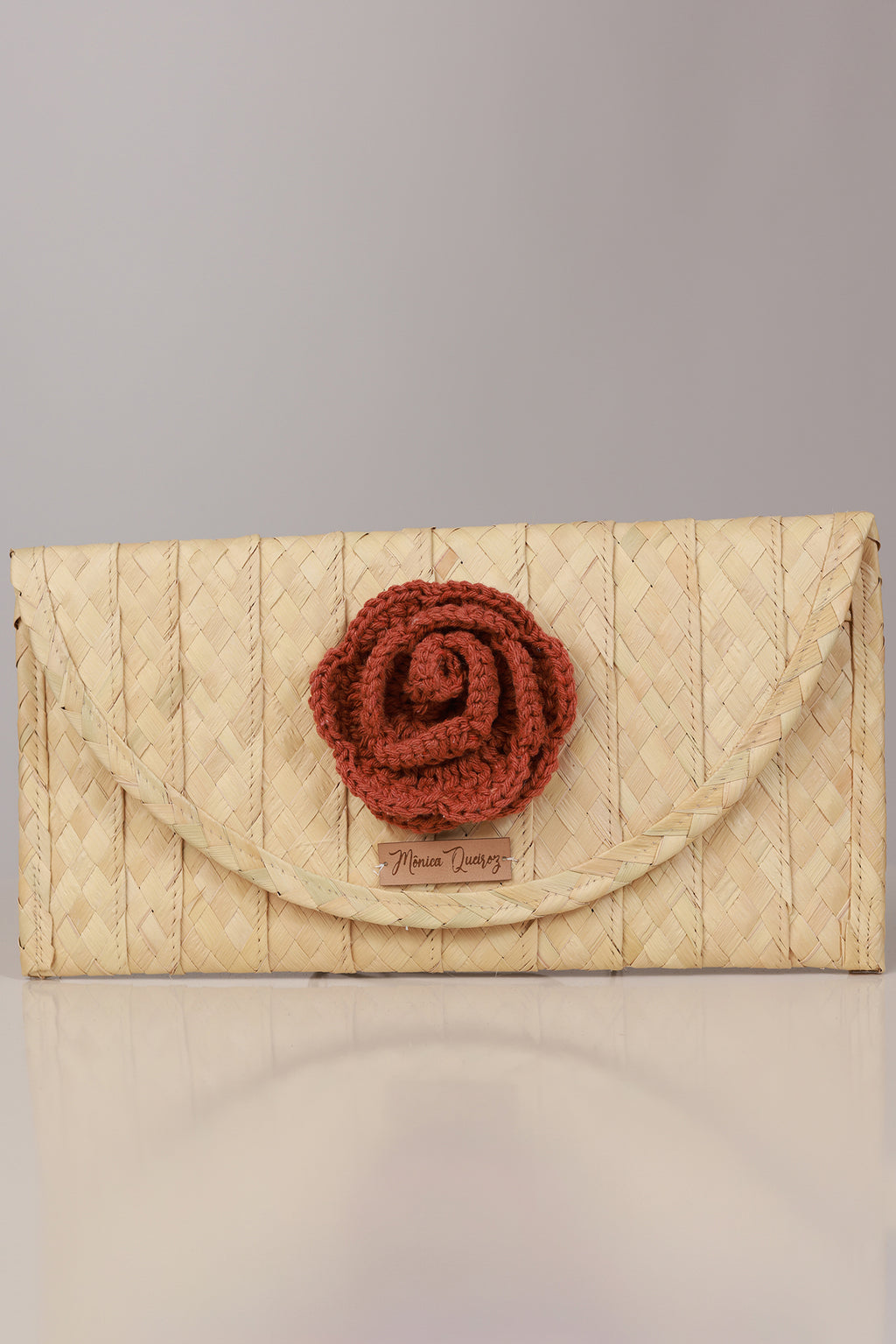 Este modelo possui formato carteira, fechamento com botão de ímã e um detalhe floral em crochê aplicado.