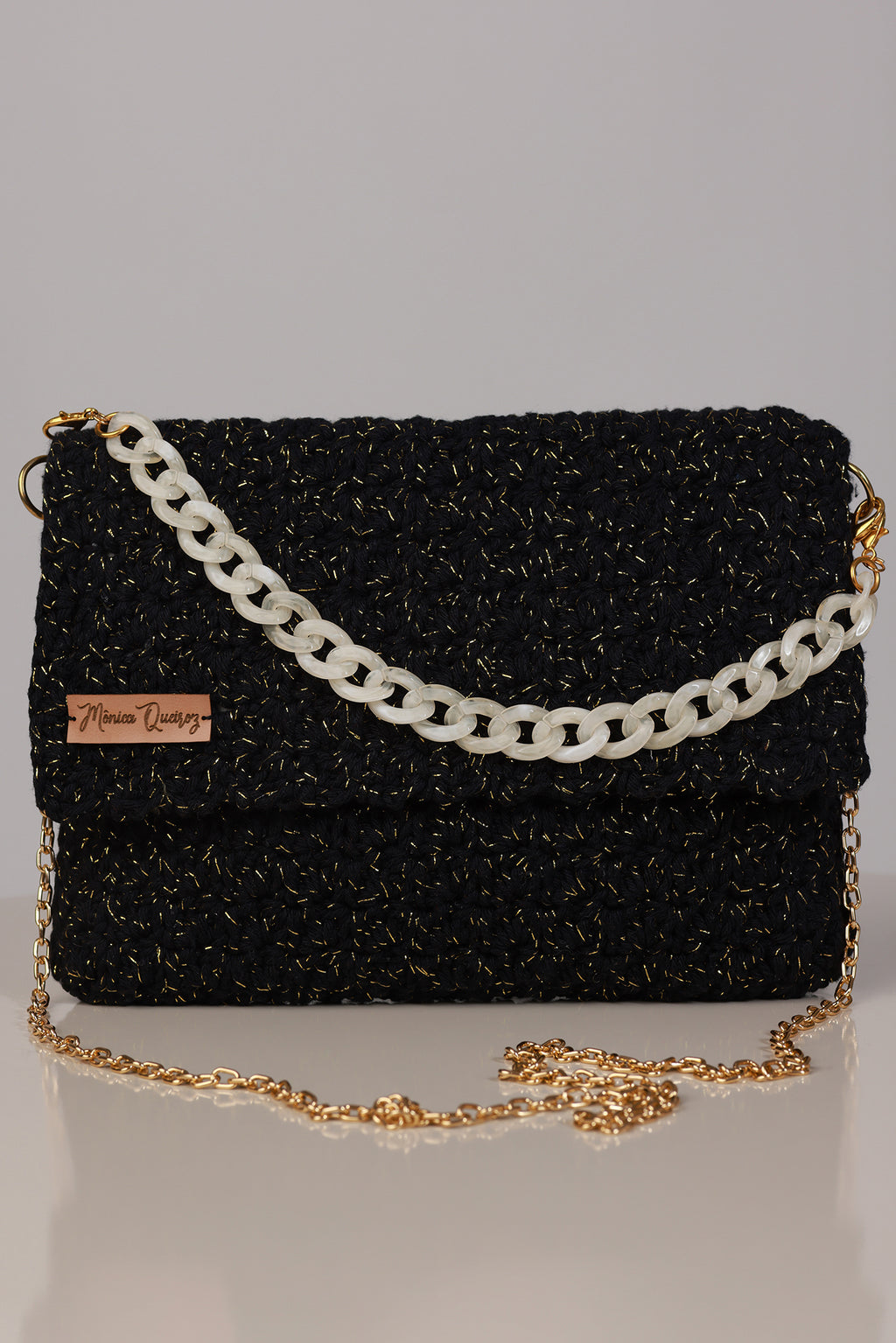 Possui fechamento com botão de ímã (magnético) e inclui duas opções de alça: uma alça de acrílico e uma alça maior dourada para uso no ombro ou transversal.