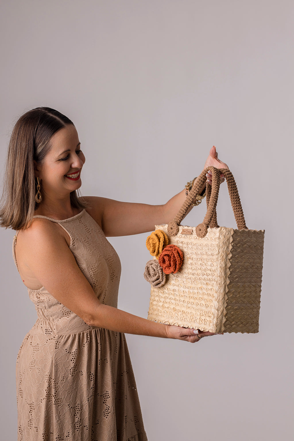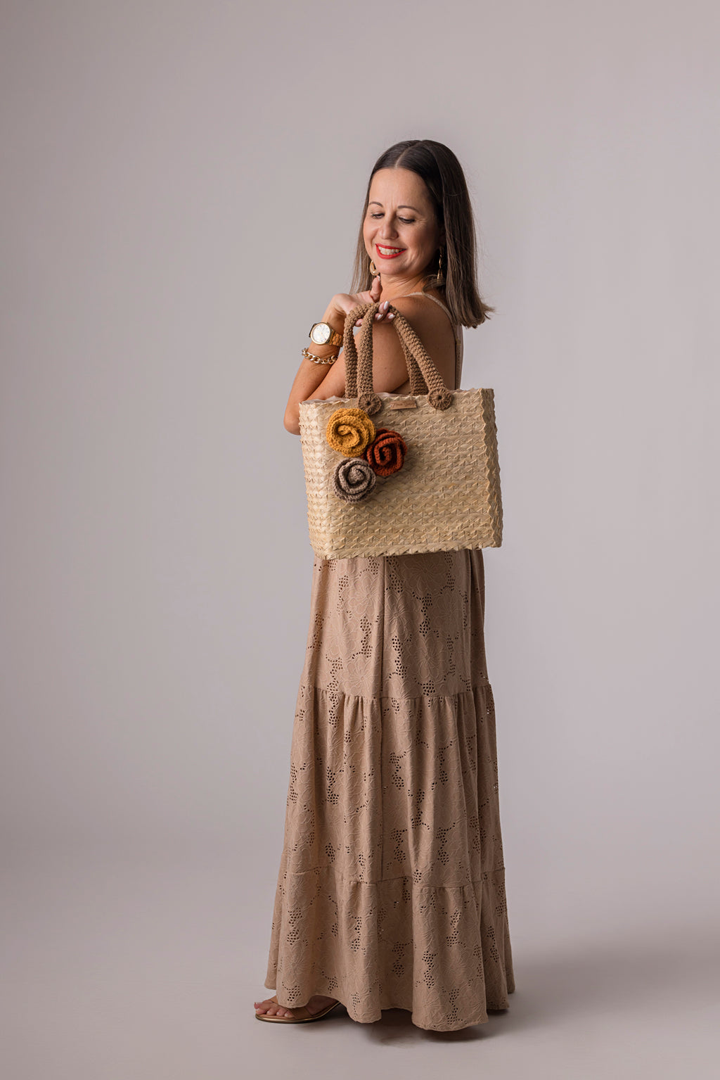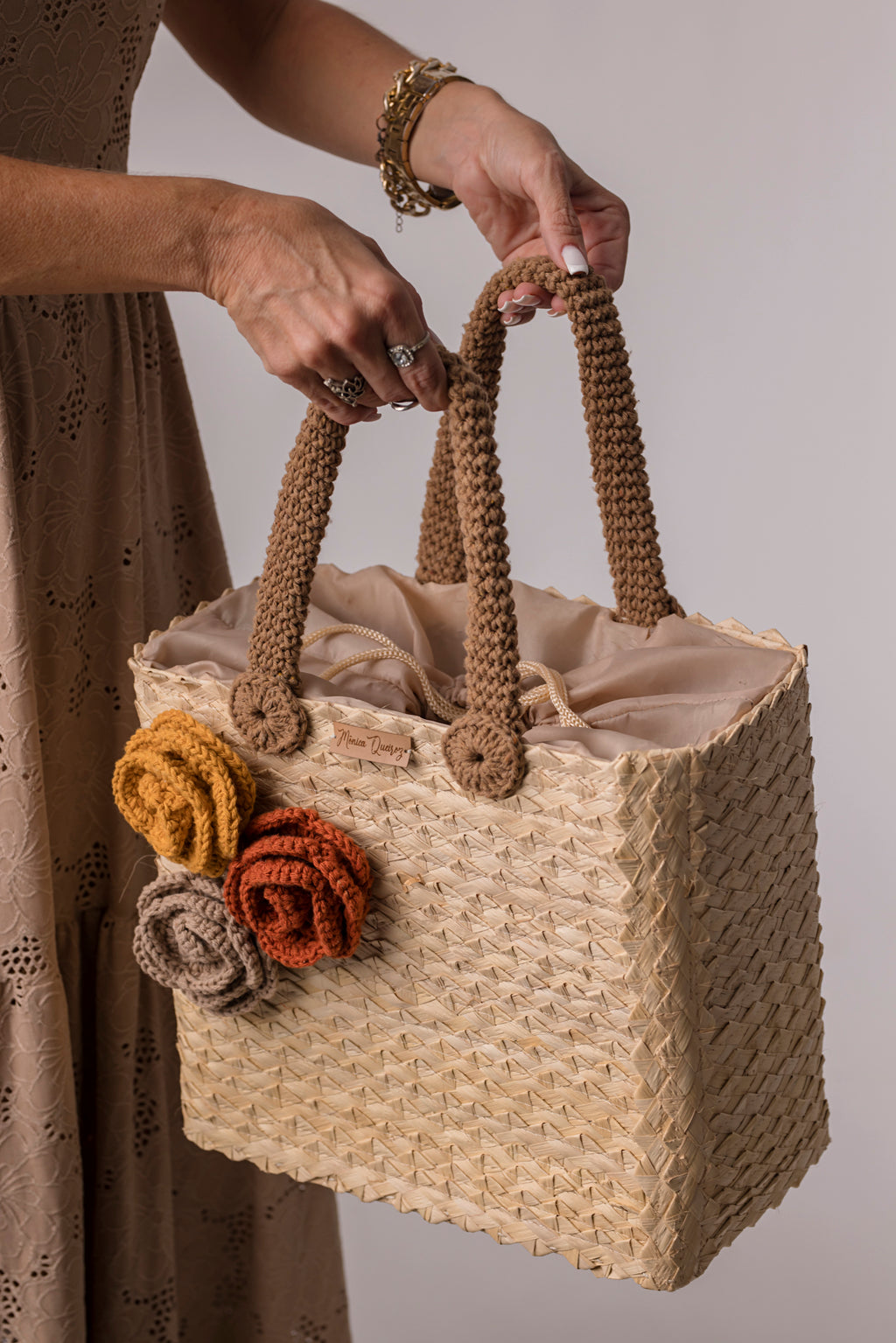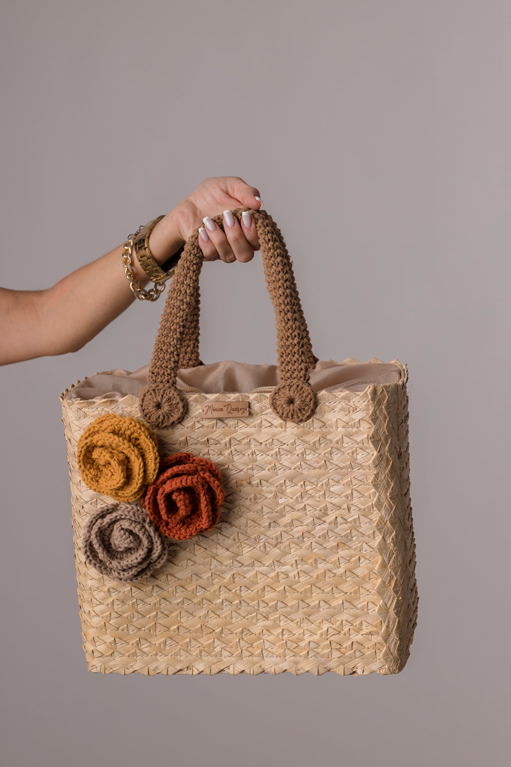 Bolsa Modelo Noronha, uma peça artesanal produzida em palha de carnaúba. Este modelo possui acabamento com detalhes de flores em crochê e alça de crochê artesanal. O interior é forrado com tecido 100% algodão.