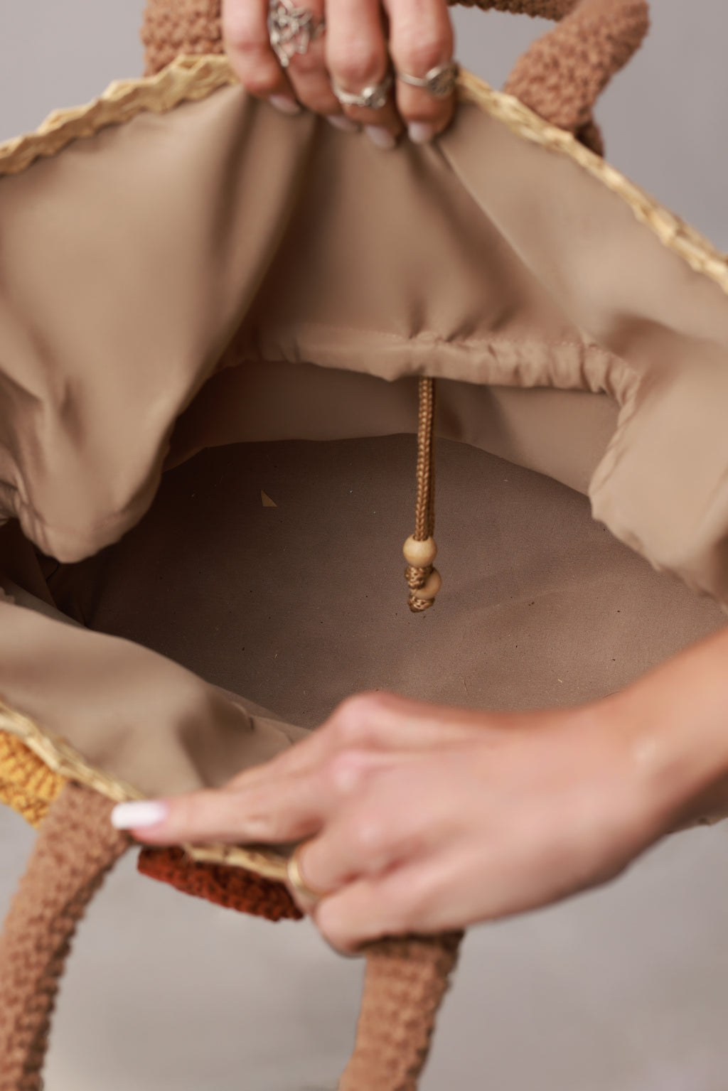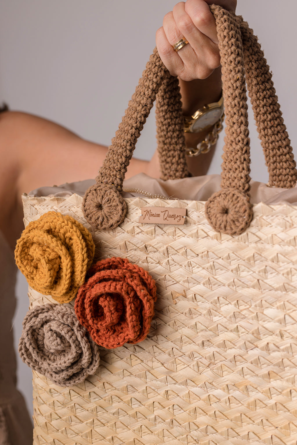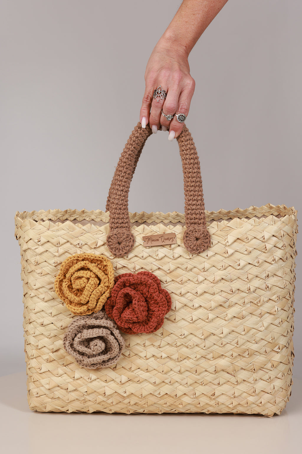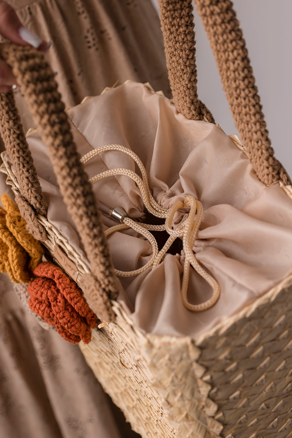 Bolsa Modelo Noronha, uma peça artesanal produzida em palha de carnaúba. Este modelo possui acabamento com detalhes de flores em crochê e alça de crochê artesanal. O interior é forrado com tecido 100% algodão.