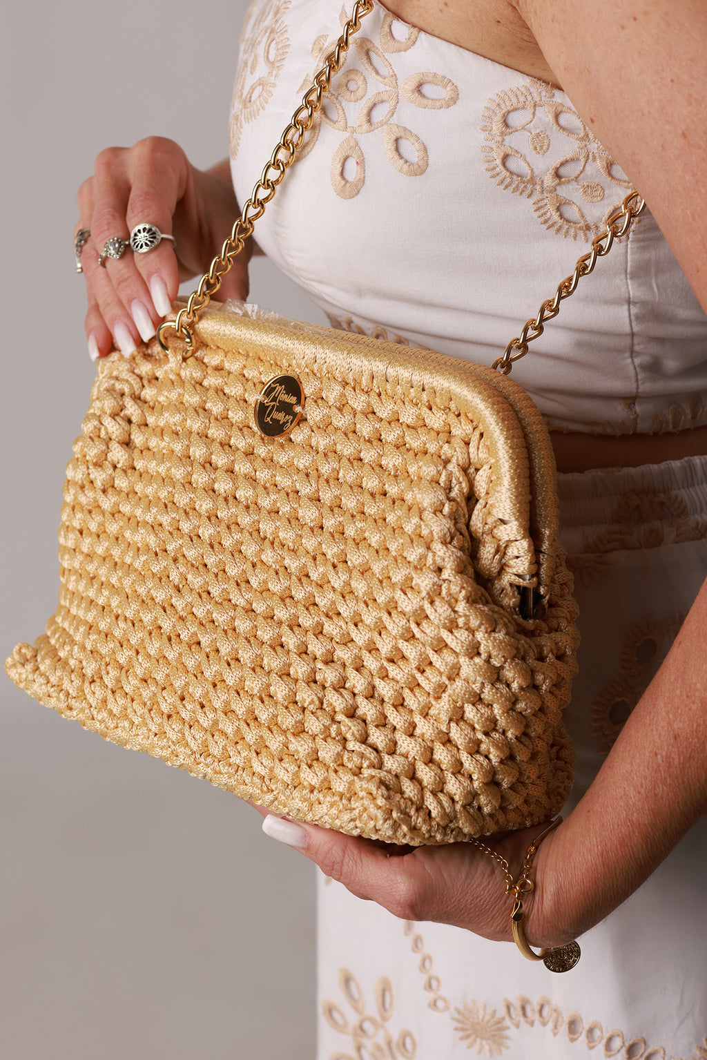 Alça: Corrente dourada (60 cm), removível, com argola articulada.