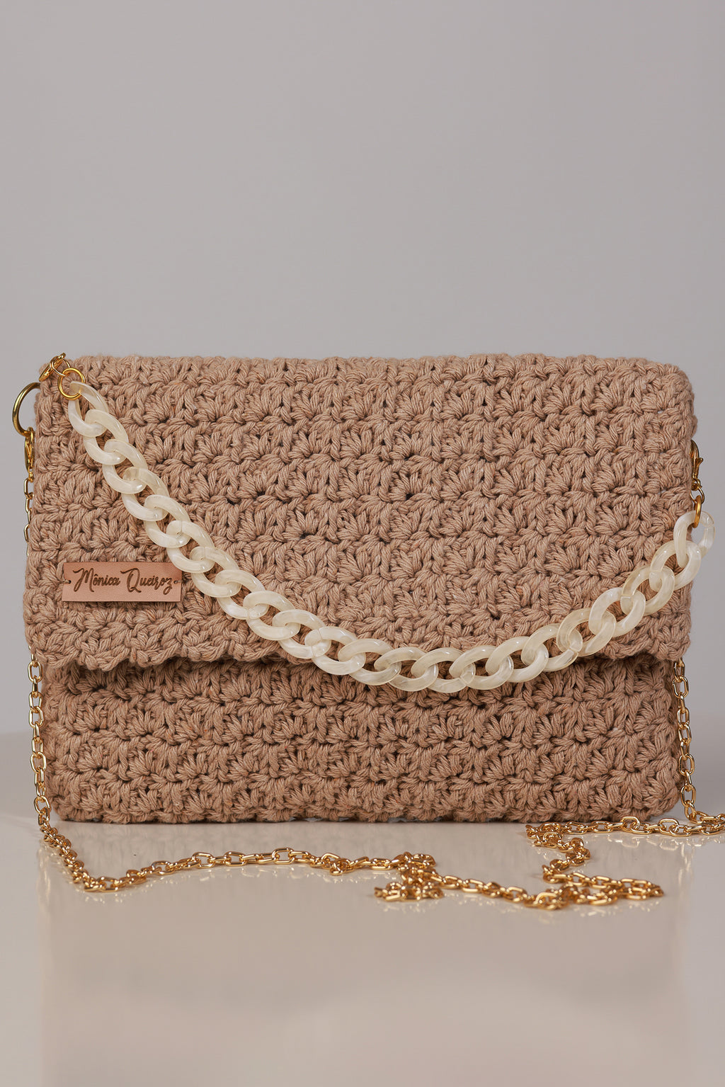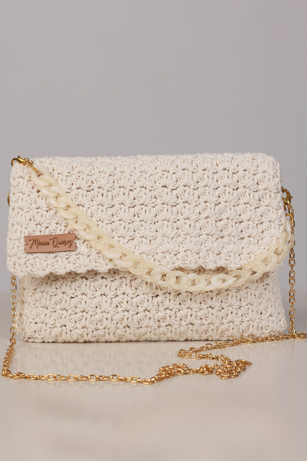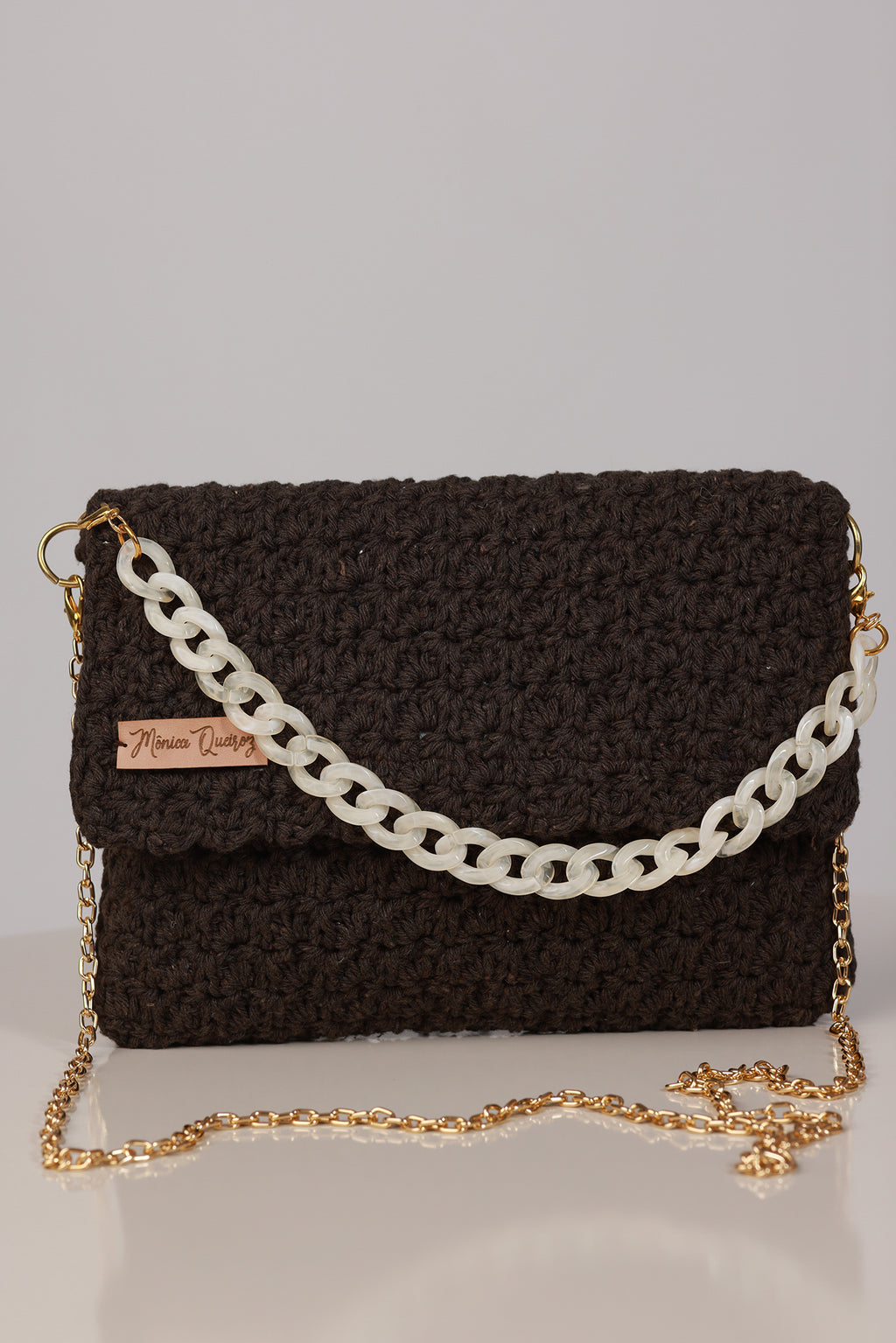 Este modelo inclui duas opções de alça: uma alça de acrílico e uma segunda alça maior dourada, permitindo o uso versátil no ombro ou transversal.