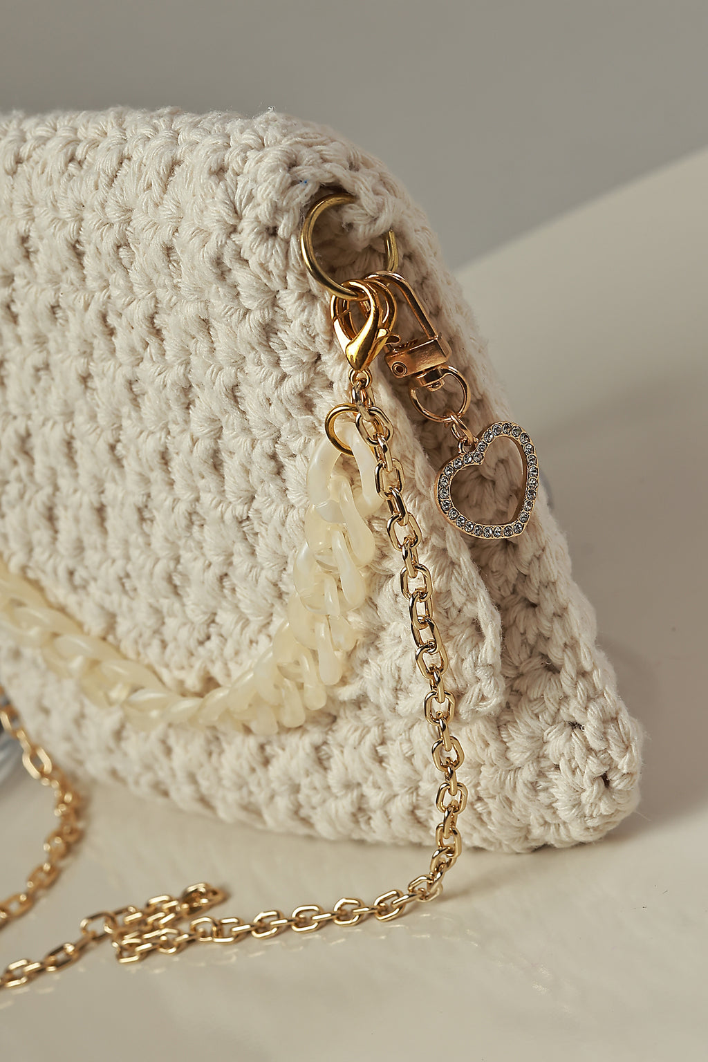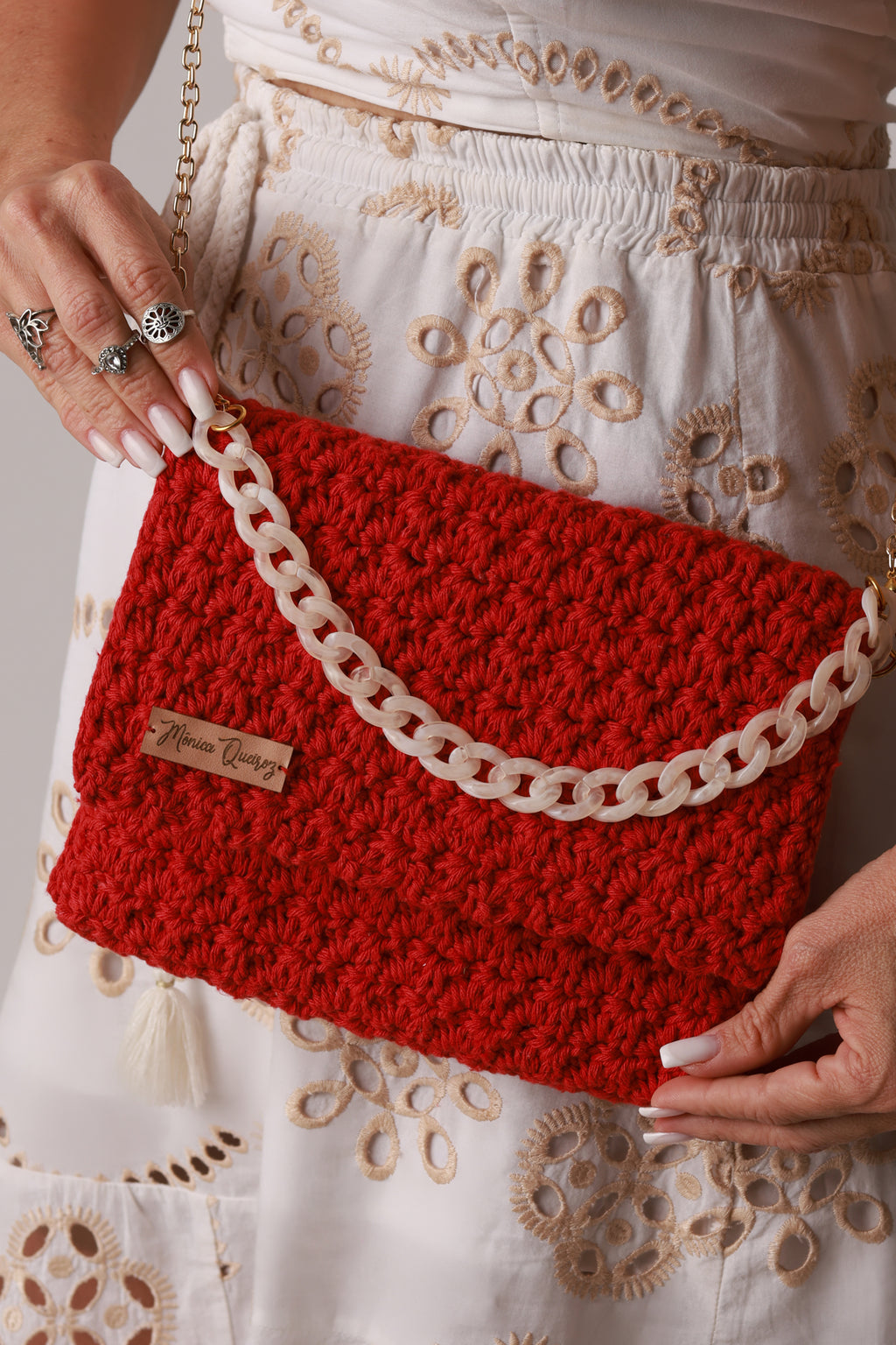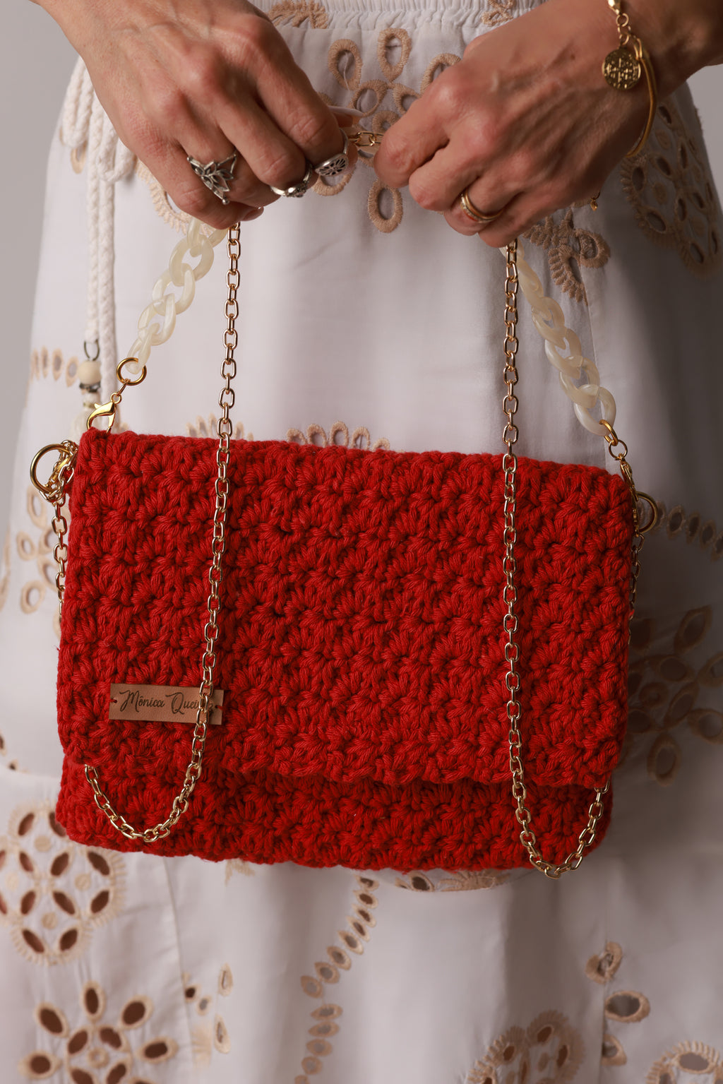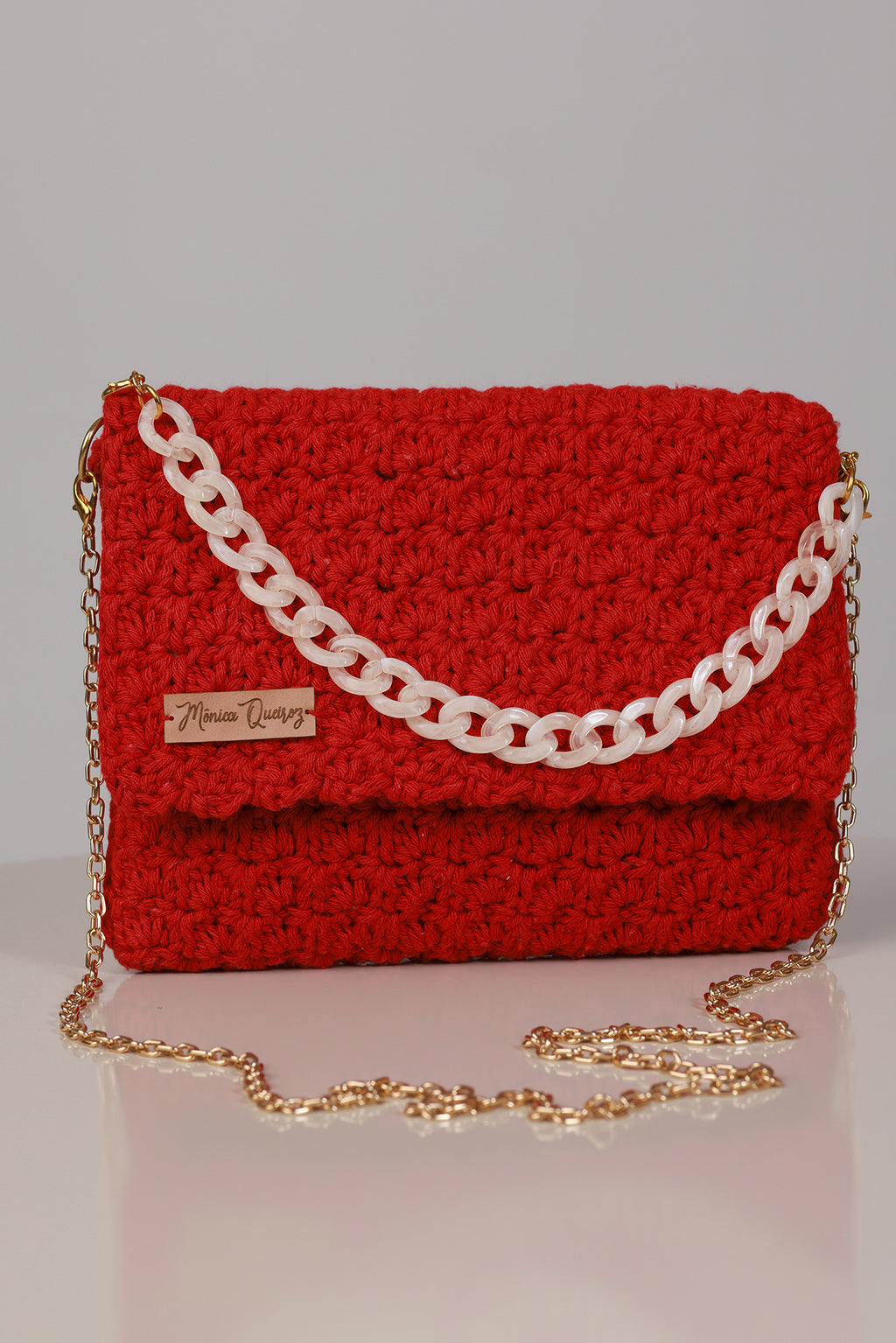 Este modelo inclui duas opções de alça: uma alça de acrílico e uma segunda alça maior dourada, permitindo o uso versátil no ombro ou transversal.
