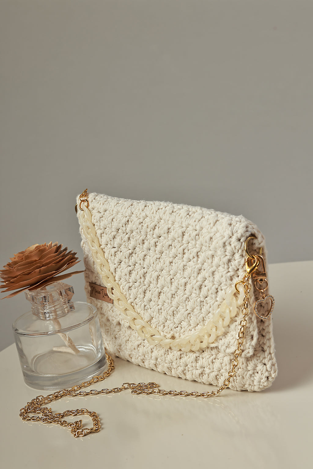 Alças: 1x alça de acrílico, 1x alça dourada (para uso ombro ou transversal).